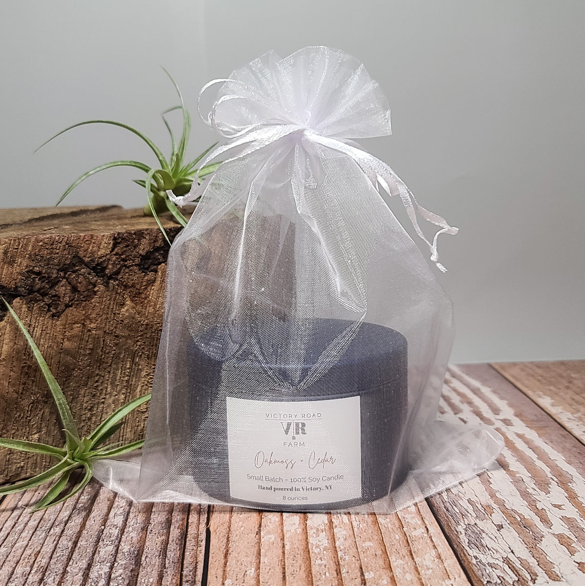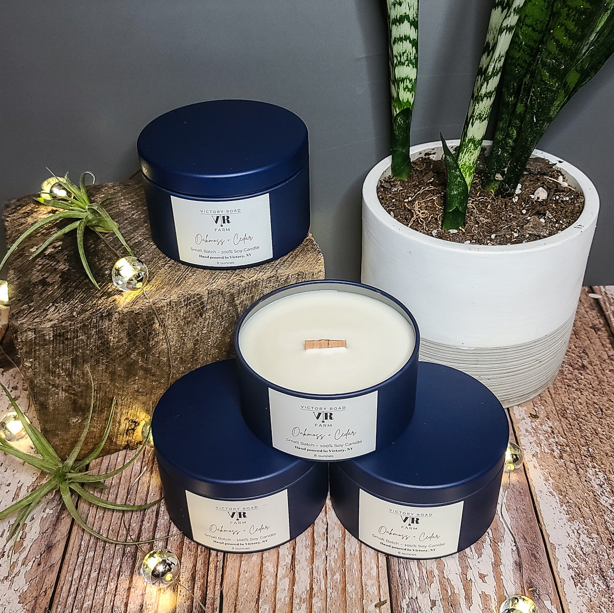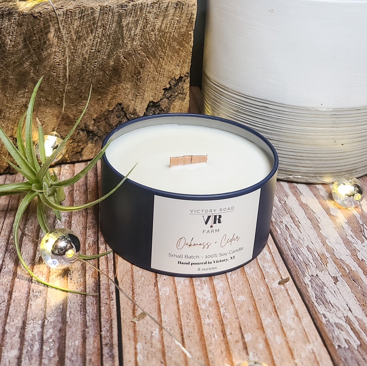Our 8 ounce Oakmoss + Cedar Soy Wax Candle has such a beautiful fragrance! Picture juicy wild citrus with aromatic spices and earthy oakmoss for a sweet, but energizing combination. It contains essential oils of Virginian Cedarwood, Grapefruit, Patchouli, Atlas Cedarwood, Geranium, Schinus Molle, Orange + Bergamot. It comes in a fun navy container with a white organza gift bag! Our elegant hand poured candles are made with 100% soy wax and feature rustic, crackling wooden wicks. You'll love our delicious scents featuring fragrant essential oils.