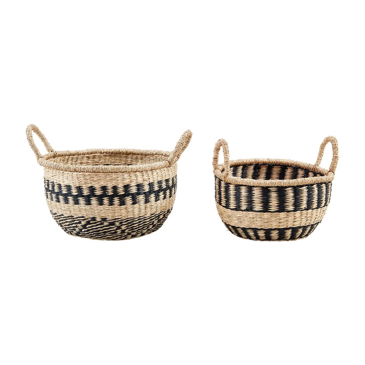 Add a touch of rustic texture with our seagrass baskets, featuring bold black tribal patterns against natural fibers. With sturdy top handles and a grounded, earthy design, these baskets are as practical as they are beautiful.