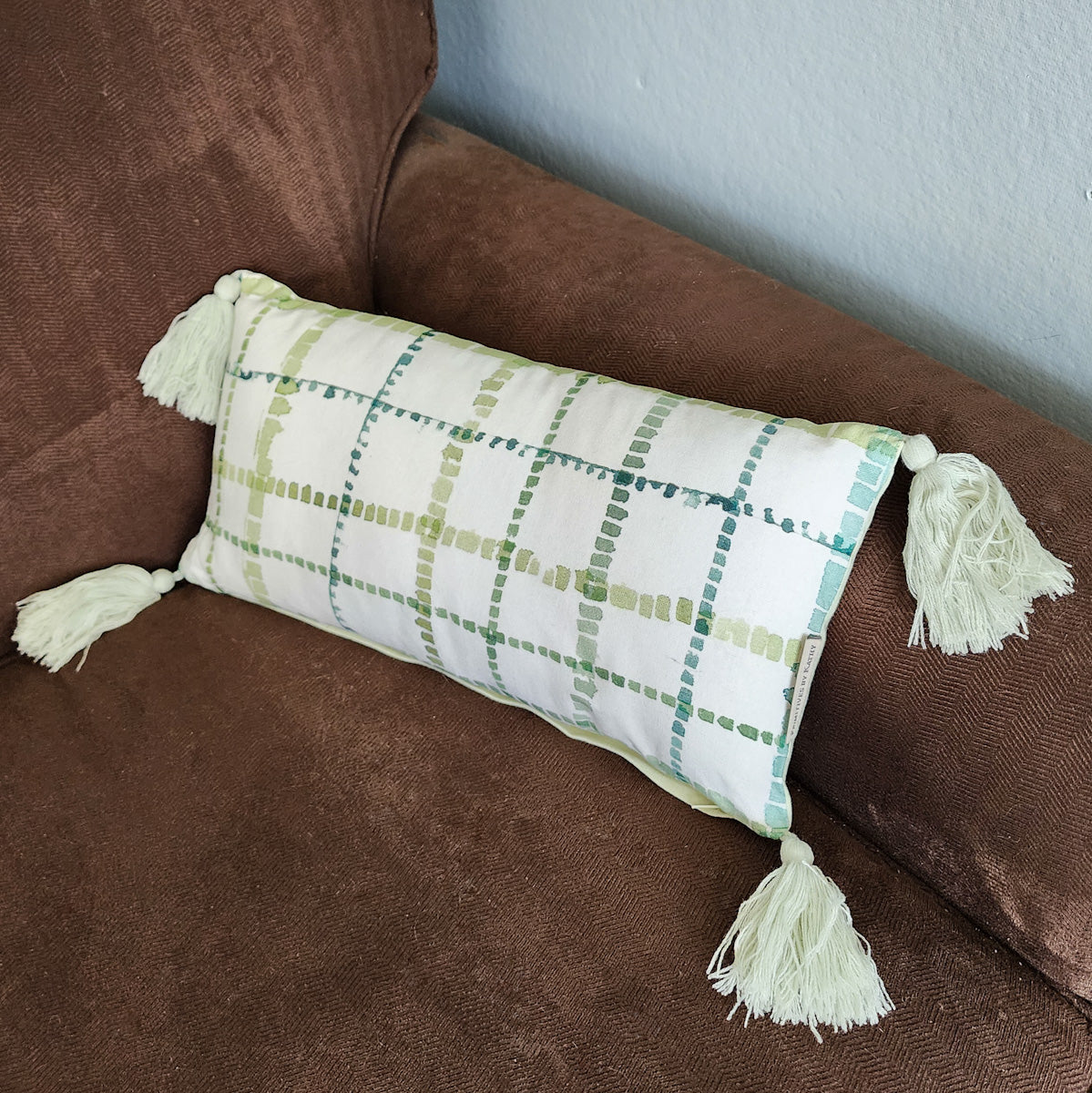 Give your space a pop of plaid personality with this charming cotton pillow! Featuring an artsy painted plaid in fresh shades of green and playful tassels on each corner, it’s like a cozy hug from spring itself. The back flaunts a soft light green hue for a little extra flair, and the hidden zipper makes cleanup a breeze—just unzip, toss the cover in the wash, and you’re good to go. Stuffed with plush polyester filling, this pillow is equal parts style and snuggle.