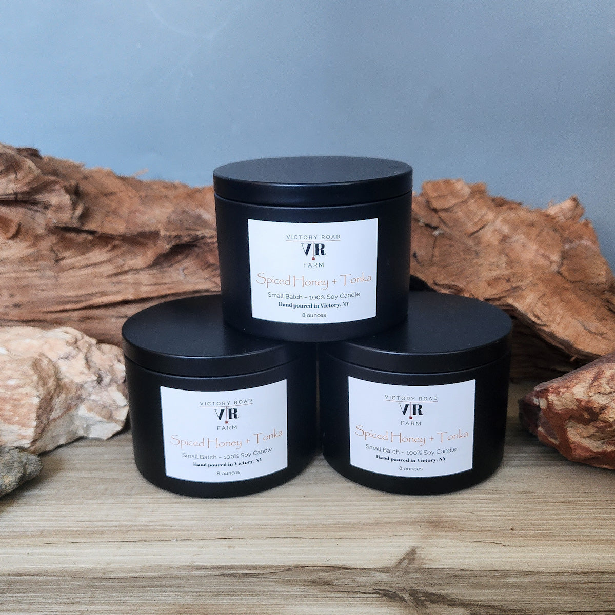 Our candles are vegan, cruelty free, and free of phthalates, carcinogens and toxins, making them a safe and beautiful way to add incredible aroma to your home. Your Spiced Honey + Tonka candle comes in our seamless 8 ounce black container with a black organza gift bag.